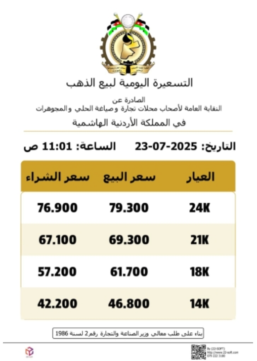 وبلغ سعر غرام الذهب من عيار 21 الاكثر طلبا لدى الأردنيين، 69.3 دينارا لغايات البيع من محلات الصاغة، مقابل 67.10 دينارا لجهة الشراء.