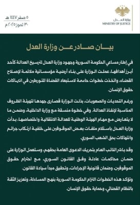 وجاء في بيان صادر عن النائب العام السوري أنه في إطار الجهود المستمرة لمحاكمة مرتكبي الجرائم بحق الشعب السوري، وانطلاقا مـن تطبيق العدالة الانتقالية، وبعد إحالة وزارة الداخلية عددا من ملفات المدعى عليهم بارتكاب هذه الانتهاكات، قمنا بدراسة الضبوط والوثائق المقدمة، وبناء عليه، تم تحريك دعوى الحق العام بحق كل من: