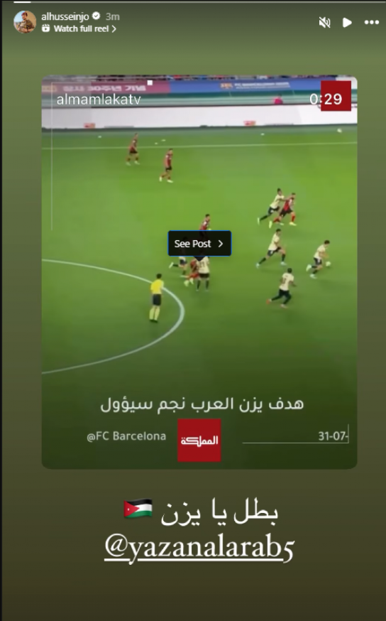 أعاد سمو الامير الحسين بن عبدالله الثاني، ولي العهد، نشر هدف نجم منتخب النشامى ونادي سيؤول الكوري الجنوبي يزن العرب بمرمى نادي برشلونة الإسباني.
