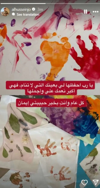 ونشر سمو ولي العهد، عبر خاصية "الستوري" على انستغرام، مجموعة من الرسومات التي رسمتها سمو الأميرة إيمان، كتب عليها، "يا رب احفظها لي بعينك التي لا تنام، فهي أكبر نعمك علي وأجملها.. كل عام وأنتِ بخير حبيبتي إيمان".