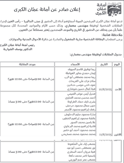 كما دعت أمانة عمان الكبرى التالية أسماؤهم لإجراء المقابلات الشخصية.