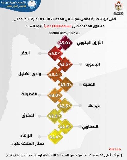 سجلت منطقة الأزرق الجنوبي أعلى درجة حرارة اليوم السبت حيث بلغت 45 درجة مئوية.
