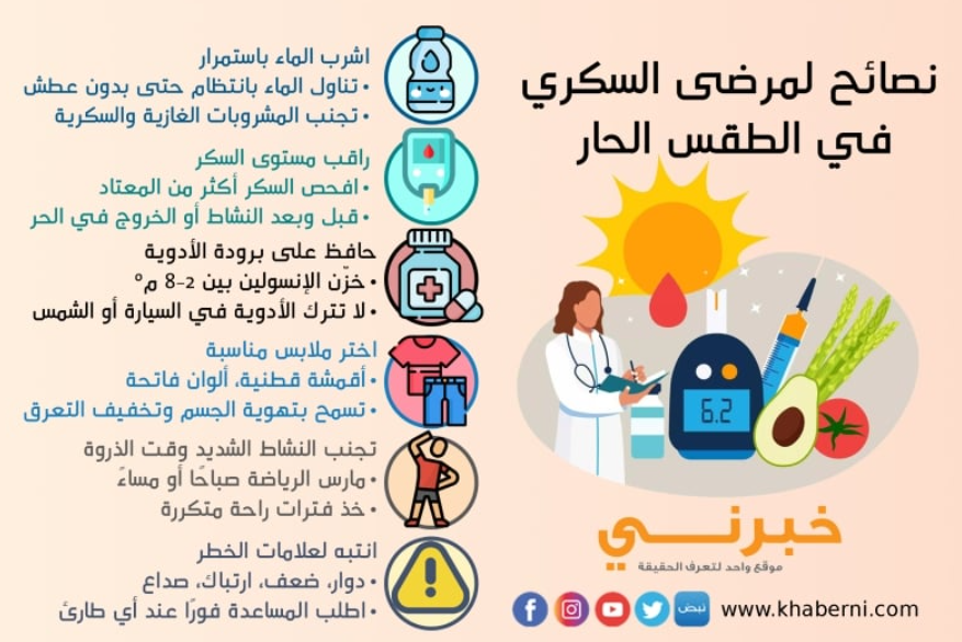 يحذّر الأطباء والمختصون مرضى السكري من التعرض المباشر لأشعة الشمس ودرجات الحرارة المرتفعة خلال فترة القبة الحرارية، مشددين على ضرورة الالتزام بمجموعة من الإرشادات الوقائية لتجنب المضاعفات الصحية.