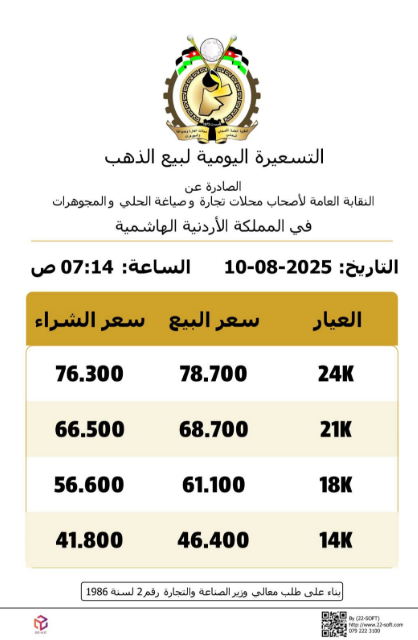 وبحسب النشرة الصادرة عن النقابة العامة لأصحاب محلات تجارة وصياغة الحلي والمجوهرات، بلغ سعر بيع الغرام الواحد من الذهب عيارات 24 و18 و14 لغايات الشراء من محلات الصاغة، 78.7 و61.1 و46.4 دينارا على التوالي.