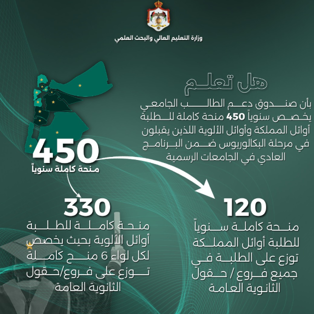 وقالت الوزارة إن تخصيص هذه المنح الكاملة يأتي في إطار حرص واهتمام الدولة الأردنية برعاية الطلبة المتفوقين، وتقديراً لجهودهم، ودعماً لمسيرتهم التعليمية، واستثماراً في مستقبلهم فهم عماد الوطن ومستقبله المشرق.