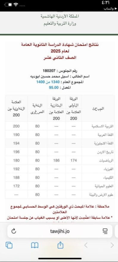 أسيل أبودية، طالبة التوجيهي للعام 2007 من مدارس الملك عبدالله الثاني للتميز في الزرقاء، والمعروفة بين محيطها بـ"بنت الآذن"، حصدت معدل 95% رغم تعرضها لأزمة صحية حادة وتشخيص طبي خاطئ أثر على مسيرتها الدراسية، لكنها رفضت الاستسلام وواصلت حتى اجتياز الامتحانات.