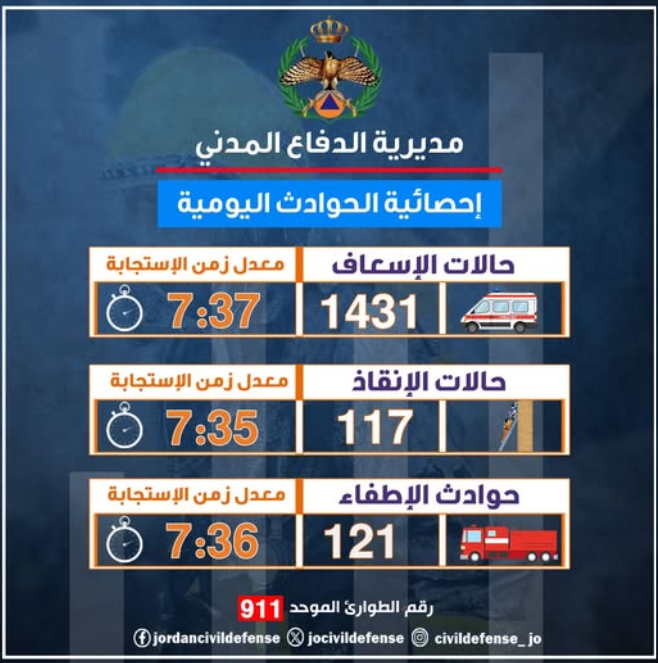 تعاملت كوادر مديرية الدفاع المدني خلال الـ 24 ساعة الماضية مع 1431 حالة إسعافية مختلفة، حيث بلغ معدل زمن الاستجابة لتلك الحالات نحو 7 دقائق و37 ثانية.