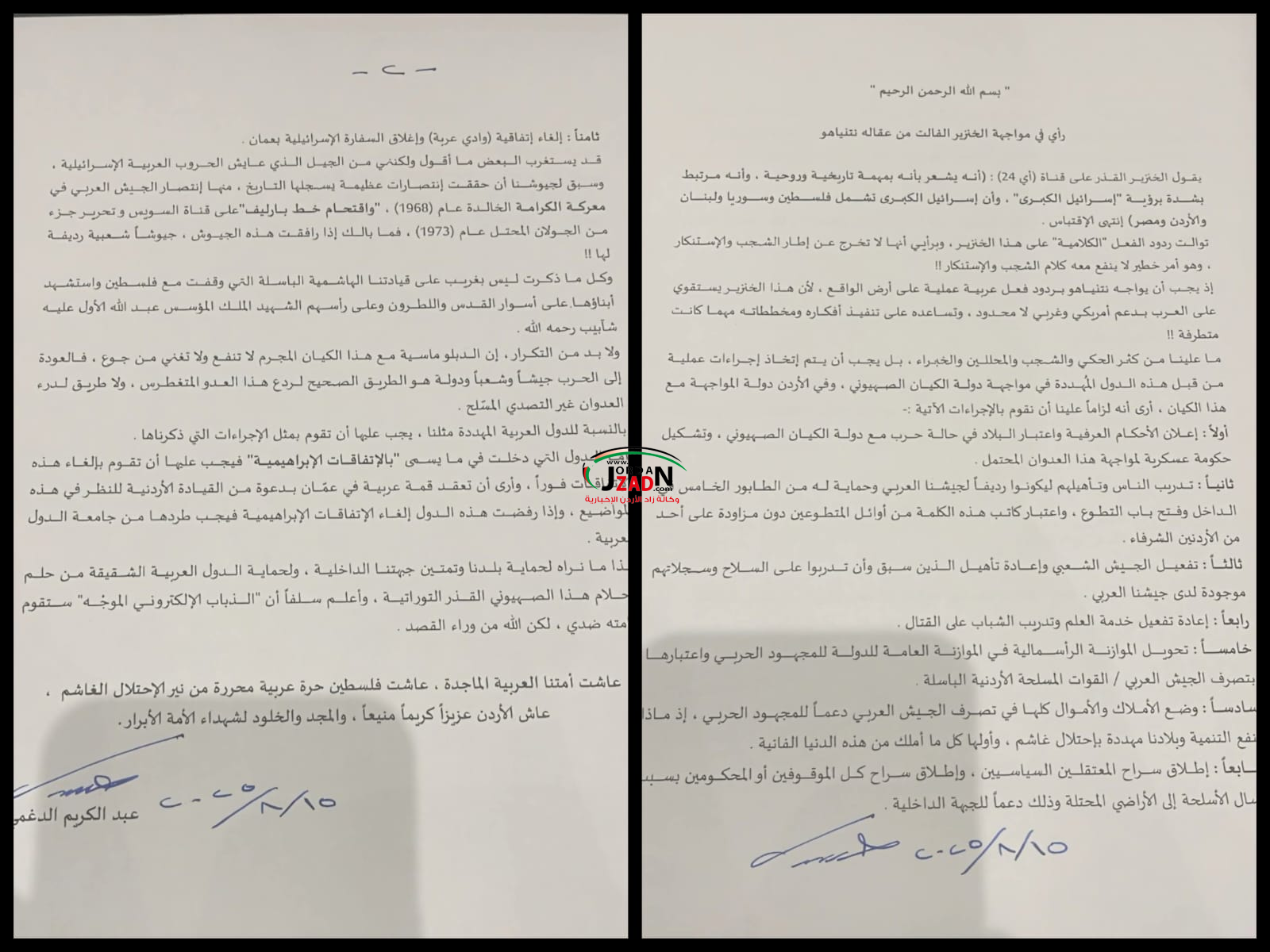 كما دعا إلى عقد قمة عربية في عمّان لبحث سبل مواجهة هذه التهديدات، مشدداً على ضرورة أن تلغي الدول الموقعة على "الاتفاقات الإبراهيمية" تلك الاتفاقيات، وإلا يتم تجميد عضويتها في جامعة الدول العربية.