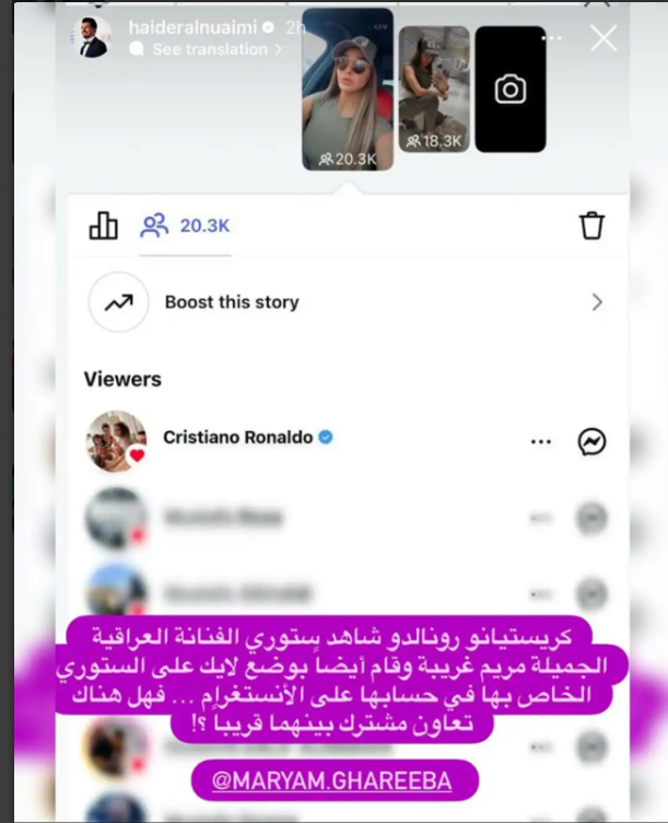 من جانبه، كشف الإعلامي حيدر النعيمي أن رونالدو قام بوضع علامة إعجاب على حالة الممثلة والمؤثرة العراقية مريم غريبة عبر موقع "إنستغرام" للتواصل الاجتماعي.