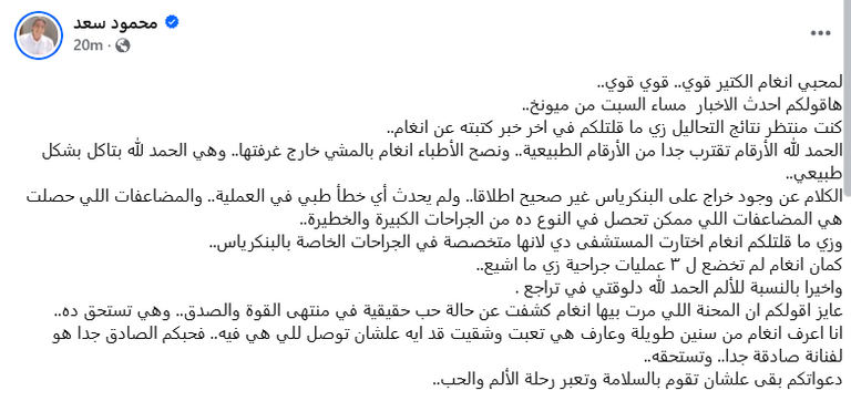 وقال سعد إن نتائج الفحوص الأخيرة جاءت مطمئنة، إذ اقتربت المؤشرات الطبية من المعدلات الطبيعية.