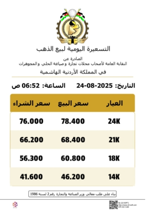كما بلغت أسعار الغرام الواحد من الذهب لعيارات 24 و18 و14 لغايات البيع من محلات الصاغة 78.4 و60.8 و46.2 دينارا على التوالي.