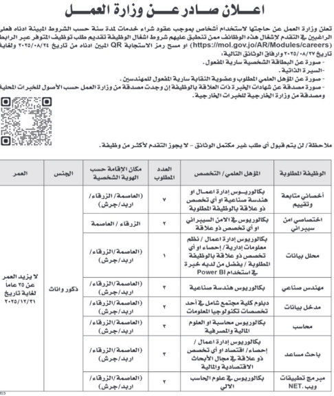 اعلنت وزارة العمل عن حاجتها لاستخدام أشخاص بموجب عقود شراء خدمات لمدة سنة.