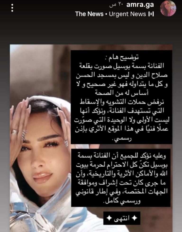 وكتبت والدتها في رسالتها: "توضيح هام: الفنانة بسمة بوسيل صوّرت بقلعة صلاح الدين، وليس بمسجد الحسن، وكل ما يتم تداوله غير صحيح ولا أساس له من الصحة. نرفض حملات التشويه والإسقاط التي تستهدف الفنانة، ونؤكد أنها ليست الأولى ولا الوحيدة التي صوّرت عملًا فنيًا في هذا الموقع الأثري بإذن رسمي"، مضيفة: "بسمة بوسيل تكنّ كل الاحترام لحرمة بيوت الله والأماكن الأثرية والتاريخية، وما جرى كان تحت إشراف وموافقة الجهات المختصة، وفي إطار قانوني ورسمي كامل".