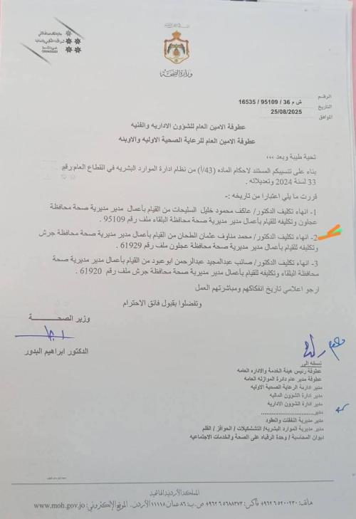 أجرى وزير الصحة الدكتور إبراهيم البدور قراراً إدارياً شمل إنهاء تكليف ثلاثة مدراء من مواقعهم الحالية، وتكليفهم بمهام إدارة مديريات صحية في محافظات أخرى.