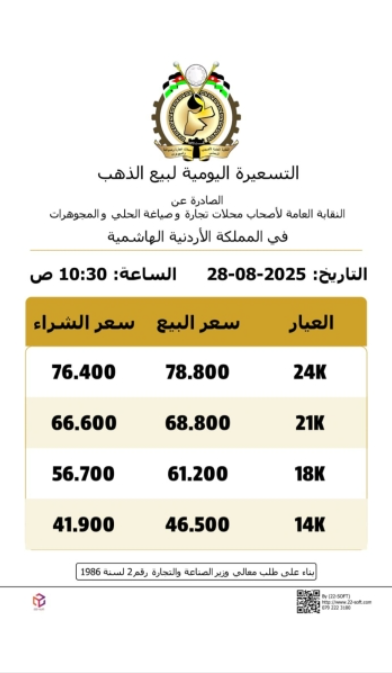 وبحسب التسعيرة اليومية، بلغ سعر غرام الذهب من عيار 21 (الأكثر طلبا من المواطنين محليا) 68.8 دينارا لغايات البيع لدى محلات الصاغة، مقابل 66.6 دينارا لغايات الشراء.