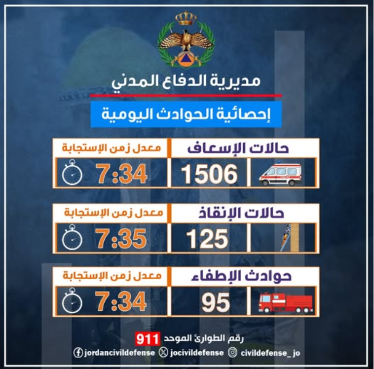 قالت مديرية الدفاع المدني إن كوادرها تعاملت خلال الـ 24 ساعة الماضية مع 1,506 حالة إسعافية بمعدل زمن استجابة بلغ 7 دقائق و34 ثانية.