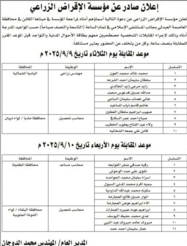دعت مؤسسة الإقراض الزراعي عدداً من المواطنين لمراجعة المؤسسة في مبناها الكائن في العبدلي - بجانب المستشفى الإسلامي وذلك لاستكمال إجراءات تعيينهم فيها، خلال مدة عشرة أيام من تاريخه ومن يتخلف عن الحضور يعتبر مستنكفاً.