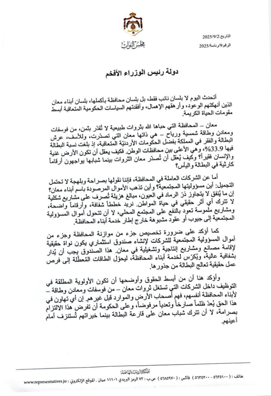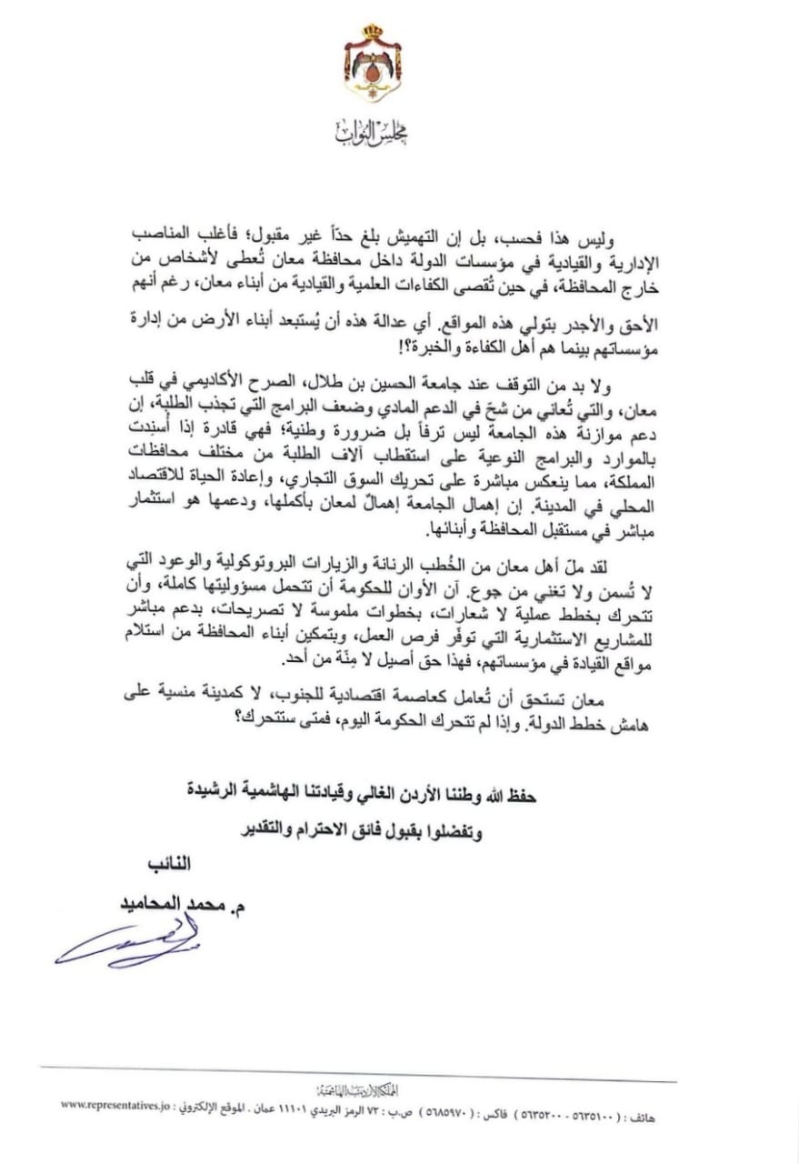 وجه النائب المهندس محمد المحاميد، خطاباً رسمياً لرئيس الوزراء، ينتقد الوعود والإهمال التي افقدت أبناء محافظة معان ابسط مقومات الحياة الكريمة، جراء السياسات الحكومية المتعاقبة، رداً على تصدر المحافظة أعلى معدل البطالة في المملكة.