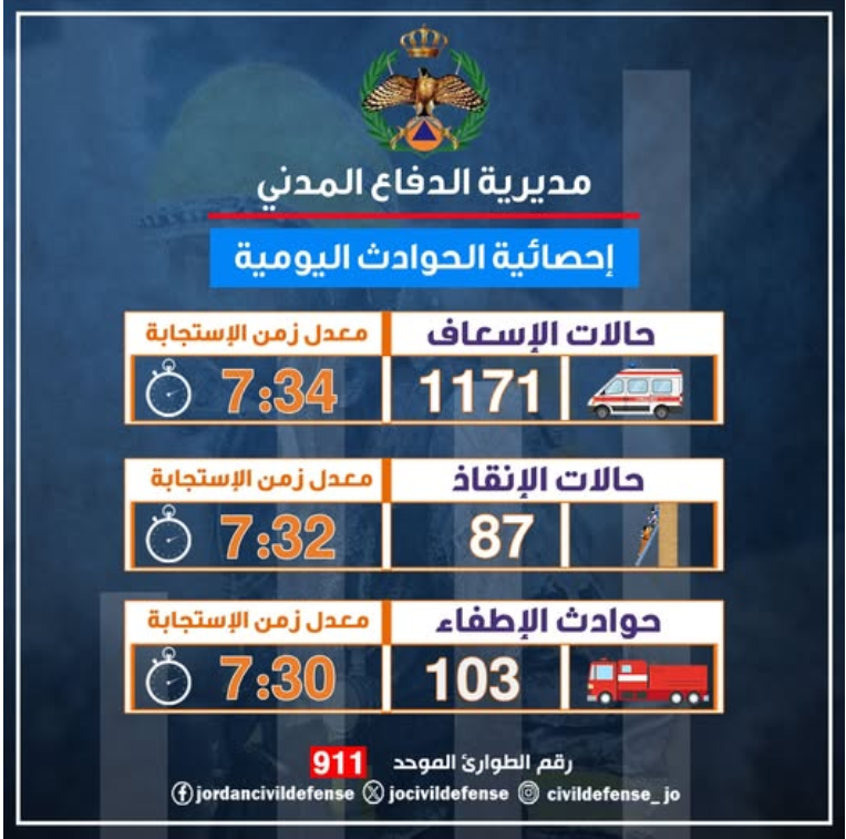 أعلنت مديرية الدفاع المدني أنها تعاملت خلال الـ 24 ساعة الماضية مع (1171) حالة إسعافية بمعدل زمن استجابة بلغ (7:34) دقيقة، إضافة إلى التعامل مع (87) حادث إنقاذ بمعدل استجابة (7:32) دقيقة، و(103) حادث إطفاء بمعدل استجابة (7:30) دقيقة.