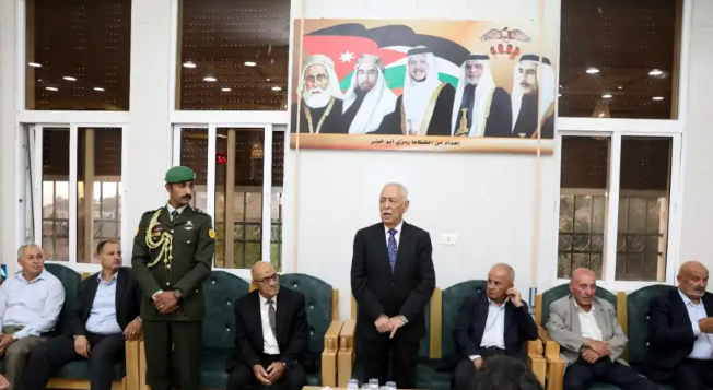 ونقل العيسوي، خلال زيارته بيت عزاء المرحوم في مدينة السلط بمحافظة البلقاء، تعازي ومواساة جلالة لملك وسمو ولي العهد، إلى ذوي الفقيد، وعموم عشيرة الغنيمات، سائلا المولى عز وجل ان يتغمده بواسع رحمته.