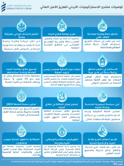 وأخيرًا، شدد المنتدى على ضرورة المطالبة بالحقوق المائية للأردن بموجب الاتفاقيات الدولية ووفقًا لمبادئ القانون الدولي، وعلى رأسها اتفاقية وادي عربة (1994) واتفاقية نهر اليرموك (1987)، من خلال تفعيل اللجان الفنية المشتركة وتطوير آليات ملزمة للمتابعة والردع، خاصة في ظل الأعباء المتزايدة التي يتحملها الأردن نتيجة استضافته لنحو ثلث سكانه من اللاجئين، الأمر الذي يتطلب تحركًا حقيقيًا يحافظ على الحقوق المائية، ويعزز من استدامة أمنه المائي.