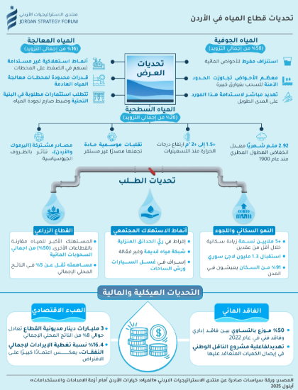 وفي جانب الطلب، أوضحت الورقة بأن تحدي النمو السكاني المتسارع في الأردن يعدّ العامل الأكبر في تزايد الطلب على المياه. فقد تضاعف عدد السكان خلال العقدين الماضيين نتيجة الزيادة الطبيعية وأزمات اللجوء. فقد ساهم اللجوء السوري (1.3 مليون لاجئ) بزيادة الطلب على المياه في محافظات الشمال بنسبة (40%). كما أن ارتفاع معدل التحضر في المملكة والتمدد السكاني والعمراني العشوائي يُشكّل تحديًا متصاعدًا يهدد استدامة الموارد المائية في الأردن.