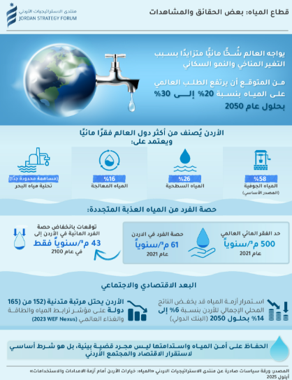 وأكدّت الورقة بأن الأردن يُعدّ من الدول الأكثر فقرًا في المياه؛ إذ تُقدَّر حصة الفرد السنوية من مصادر المياه العذبة المتجددة بنحو (61) مترًا مكعبًا سنويًّا خلال العام (2021)، وهو أقل بكثير من حد الفقر المائي العالمي المطلق والبالغ (500) متر مكعب سنوياً. وفي هذا السياق نوهت الورقة إلى أنه، وفي حال استمر نمط الاستهلاك الحالي، فمن المتوقع أن تنخفض حصة الفرد في الأردن إلى (43) مترًا مكعبًا فقط في العام 2100.