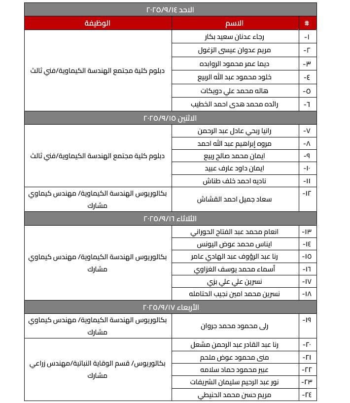 تدعو مؤسسة المواصفات والمقاييس الأردنية المذكورين أدناه مراجعة مديرية الموارد البشرية في مبنى الإدارة العامة رقم (1) الكائن في (عمان، دابوق، شارع خير الدين المعاني) بالتواريخ المبينة أدناه في تمام الساعة الثامنة والنصف صباحاً وذلك لإجراء المقابلات الشخصية وكل من يتخلف عن الحضور يعتبر مستنكفاً مصطحبين معهم ما يلي: -