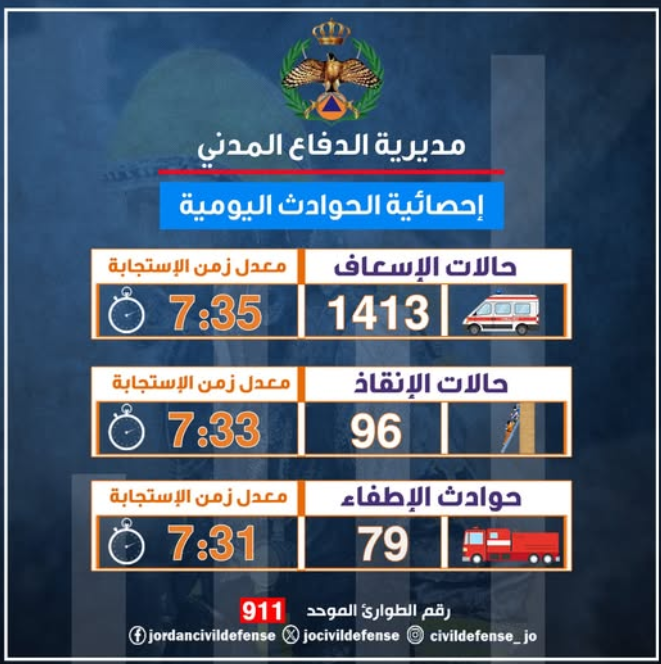 أعلنت مديرية الدفاع المدني، أنها تعاملت خلال الـ24 ساعة الماضية مع (1413) حالة إسعافية مختلفة، بمعدل زمن استجابة بلغ (7:35) دقيقة.