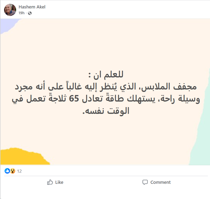 مجفف الملابس، الذي يُنظر إليه غالباً على أنه مجرد وسيلة راحة، يستهلك طاقةً تعادل طاقة 65 ثلاجة تعمل في الوقت نفسه."