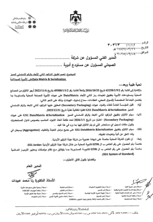 ووفقًا للتعميم الصادر، يتوجب على الأدوية المصنعة محليًا أن تحمل أرقام GTIN صادرة عن هيئة الترقيم الأردنية GS1 Jordan مع الحصول على شهادة عضوية بذلك، فيما يجب أن تكون أرقام GTIN للأدوية المستوردة متوافقة مع نظام معايير GS1 العالمية (GS1 System of Standards).