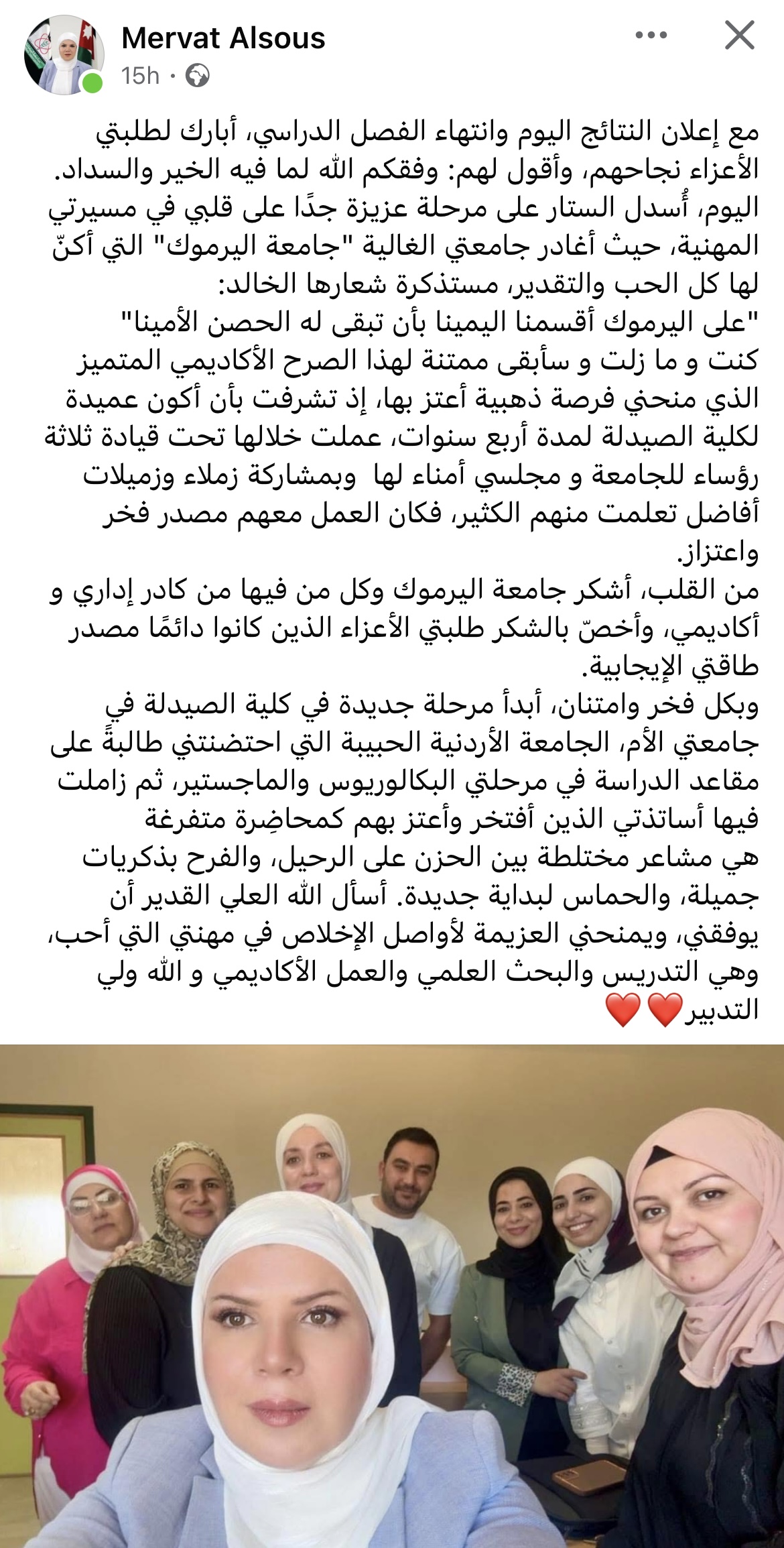 اليوم، يودّع طلبة اليرموك عميدتهم السابقة بدموع ممزوجة بالفخر، فيما تستقبل الجامعة الأردنية شخصية أكاديمية مرموقة يُنتظر أن تسهم بخبرتها وكفاءتها في تطوير برامجها ودعم طلبتها ونشاطاتهم كما اعتادت دومًا.