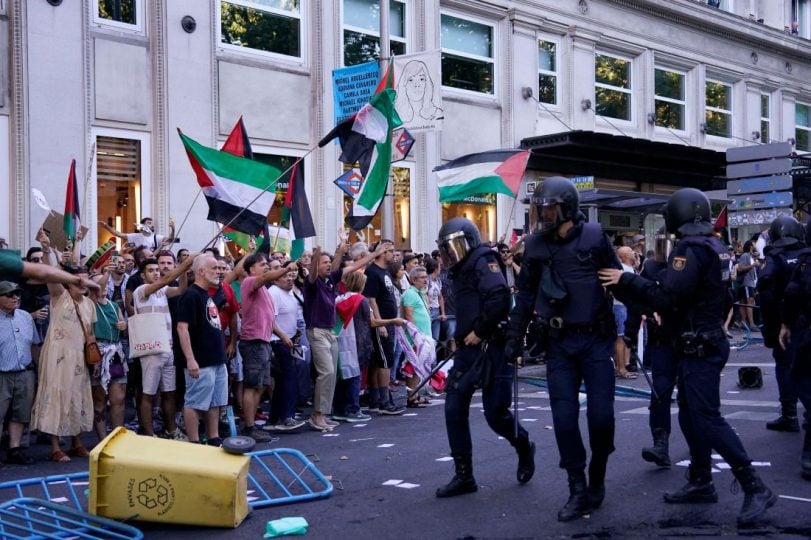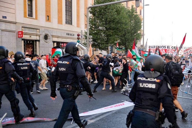 واقتحم متظاهرون يلوّحون بالعلم الفلسطيني ويرددون شعارات مؤيدة لغزة، الحواجز في شارع غران فيا الشهير في وسط العاصمة السياحي ودخلوا إلى مسار السباق.