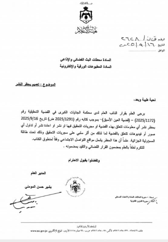 وأكدت الهيئة في كتابها الصادر أمس الثلاثاء الموافق 16 أيلول 2025، أنه يحظر نشر أو إعادة نشر أو تداول أي معلومات أو صور أو فيديوهات تتعلق بالقضية أو مجريات التحقيق فيها، لما لذلك من أثر سلبي على سير التحقيق، مشددة على أن المخالفين سيتحملون المسؤولية الجزائية.