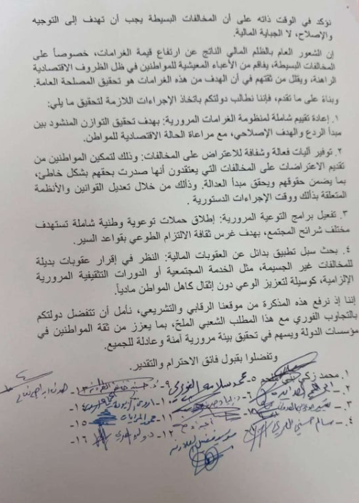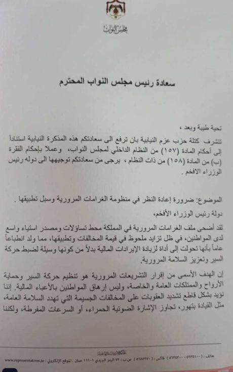 طالبت كتلة حزب "عزم" النيابية من خلال مذكرة رسمية إلى رئيس مجلس النواب، بإعادة النظر في منظومة مخالفات السير وطرق تطبيقها، في ظل ما وصفوه بارتفاع غير مبرر في قيمة المخالفات، وانعكاساتها السلبية على المواطنين.