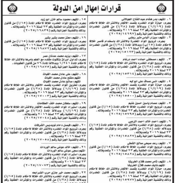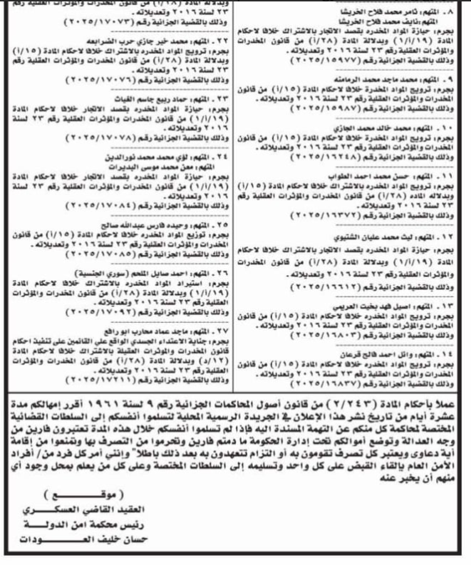 قرر رئيس محكمة أمن الدولة، العقيد القاضي العسكري حسان خليف العودات، إمهال مجموعة من المتهمين مدة عشرة أيام اعتباراً من اليوم الاثنين 22/9/2025، وإلا سيُعتبرون فارّين من وجه العدالة.