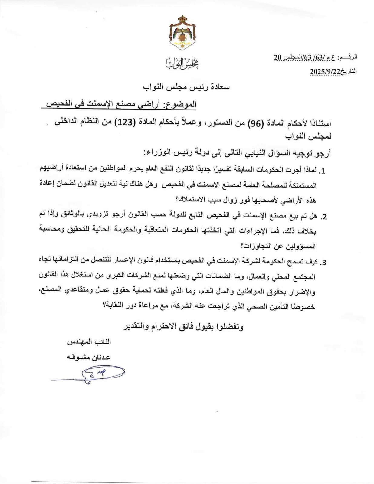 وسأل مشوقة الرئيس حسان: "لماذا أجرت الحكومات السابقة تفسيرا جديدا لقانون النفع العام يحرم المواطنين من استعادة أراضيهم المستملكة للمصلحة العامة لمصنع الاسمنت في الفحيص؟ وهل هناك نية لتعديل القانون لضمان إعادة هذه الأراضي لأصحابها فور زوال سبب الاستملاك؟".