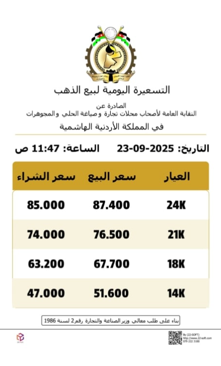 وبحسب التسعيرة الرسمية الصادرة عن النقابة العامة لأصحاب محلات تجارة وصياغة الحلي والمجوهرات ، انخفض سعر غرام الذهب عيار 21 ، بمقدار 30 قرشا عن تسعيرة امس الاثنين ، ليبلغ سعر الغرام الواحد 76.5 دينار.