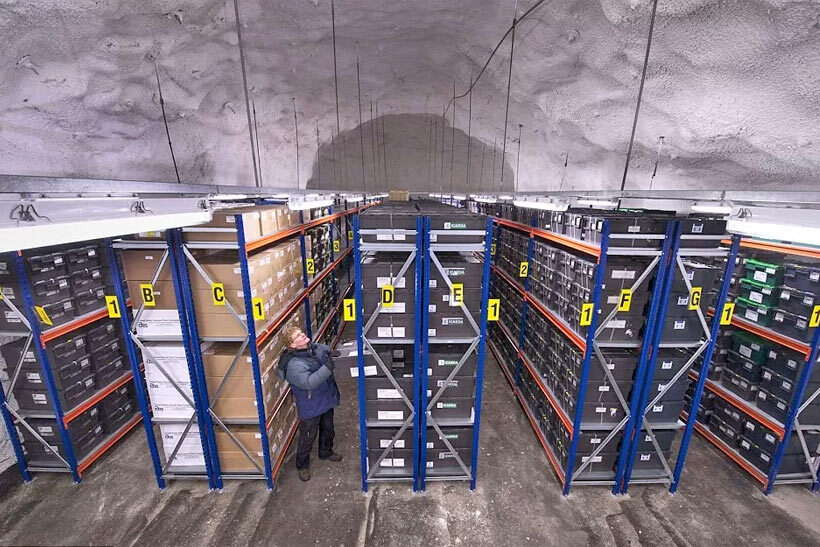 يقع "قبو يوم القيامة" على عمق 120 مترا تحت الأرض و130 مترا فوق مستوى سطح البحر في منطقة ذات نشاط تكتوني ضئيل. وتخبأ حاويات البذور خلف أبواب مقاومة للانفجار في حجرات خاصة. هكذا تبدو الغرفة رقم 1.