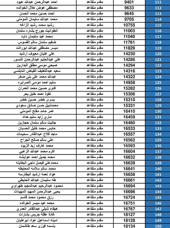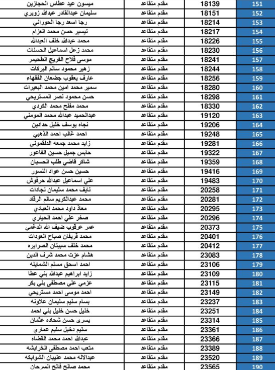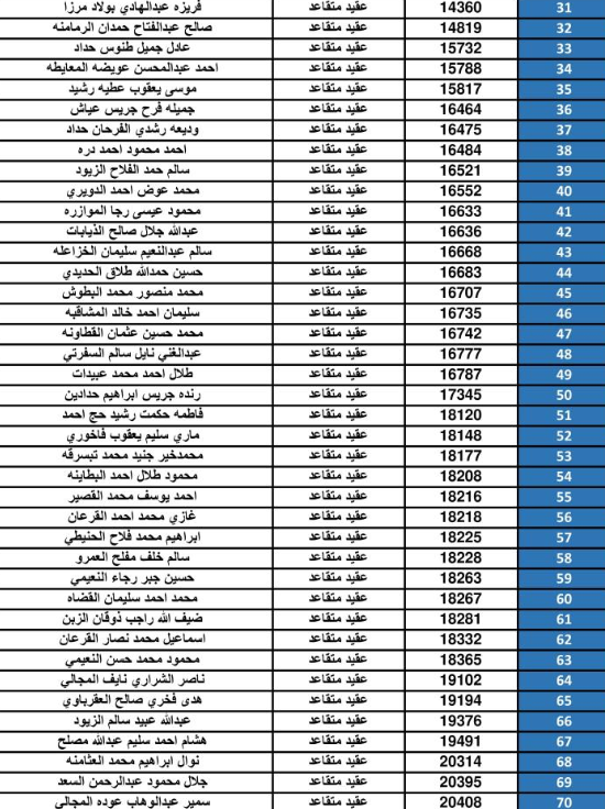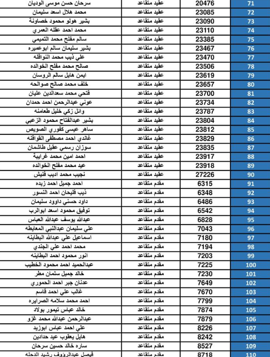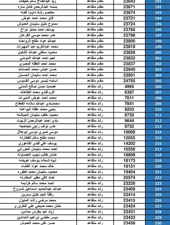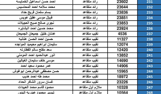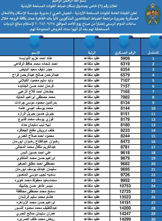 أعلنت القيادة العامة للقوات المسلحة الأردنية – الجيش العربي/ مديرية مؤسسة الإسكان والأشغال العسكرية بضرورة مراجعة الضباط المستفيدين من صندوق إسكان ضباط القوات المسلحة الأردنية المبينة أسماءهم أدناه بنك القاهرة عمان بكافة فروعه خلال ساعات الدوام الرسمي اعتباراً من يوم الأحــد الموافق 28/09/2025 لاستلام مبالغ الرديات المستحقة لهم بعد أن انهوا سداد القروض الممنوحة لهم.