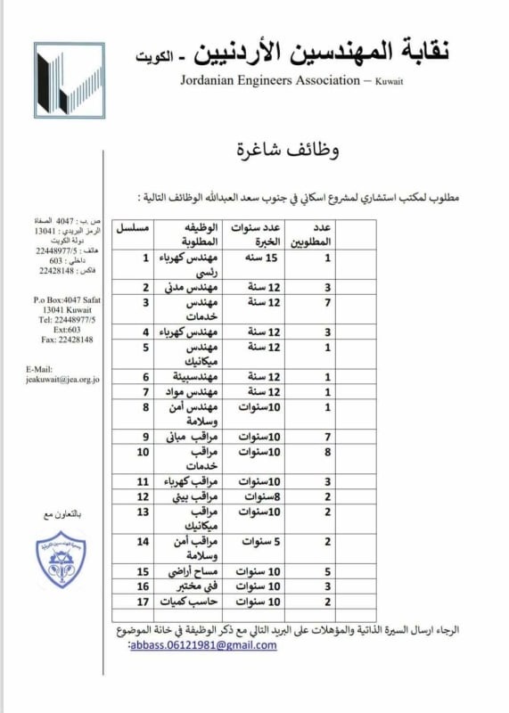 أعلنت إحدى الشركات الكبرى في دولة الكويت عن توفر فرص عمل شاغرة في عدة تخصصات، موجهة دعوتها للكوادر الأردنية الراغبة بالانضمام إليها، وذلك في إطار تعزيز طاقمها بالخبرات المهنية المؤهلة.