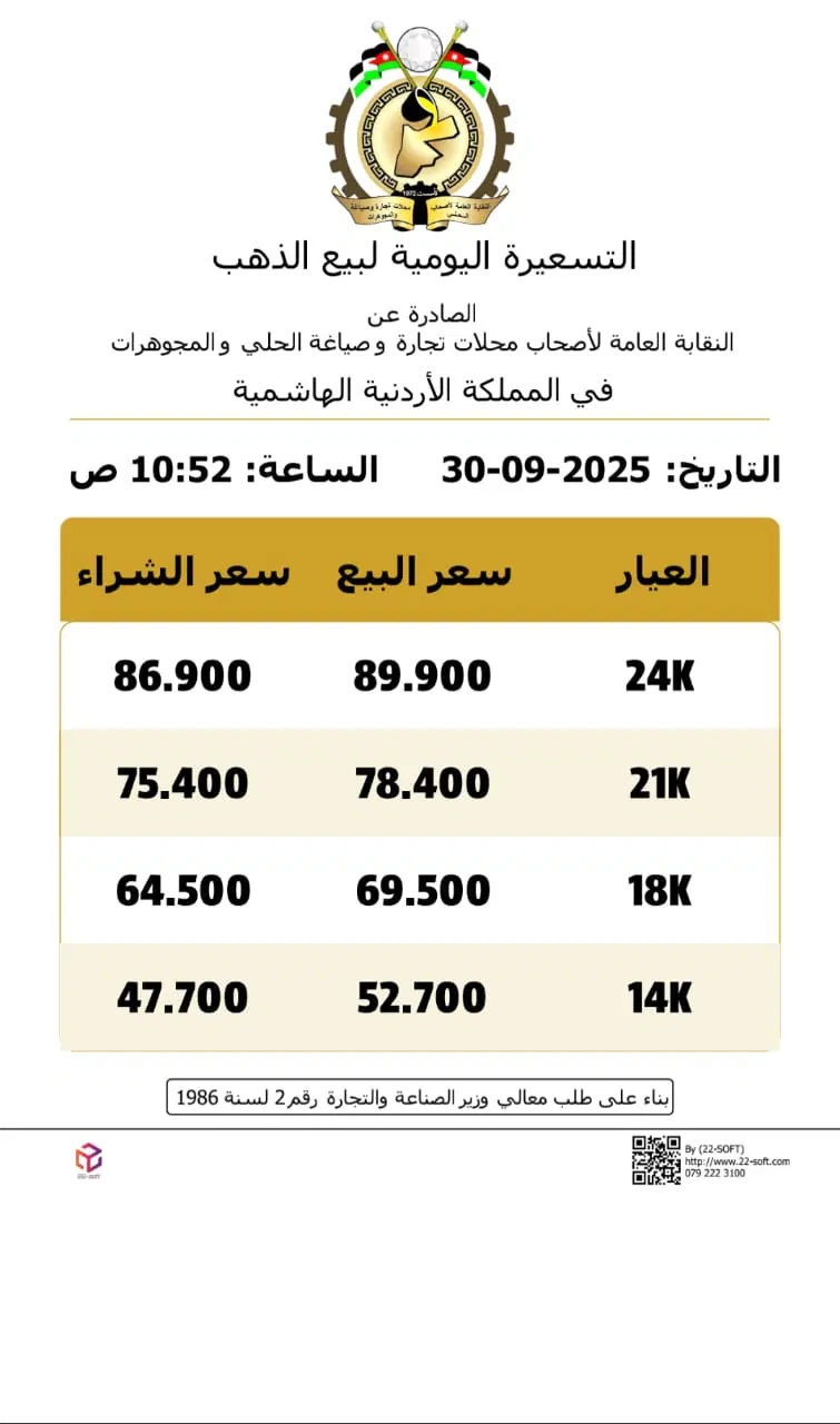 اظهرت التسعيرة اليومية لبيع الذهب في الاردن لهذا اليوم، الصادرة عن النقابة العامة لاصحاب محلات تجارة وصياغة الحلي والمجوهرات اسعار عيارات الذهب الاربعة المتداولة في السوق الاردني.