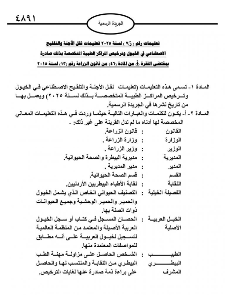 صدر في عدد الجريدة الرسمية اليوم الاربعاء، تعليمات نقل الأجنة والتلقيح الاصطناعي في الخيول وترخيص المراكز الطبية المتخصصة بذلك.