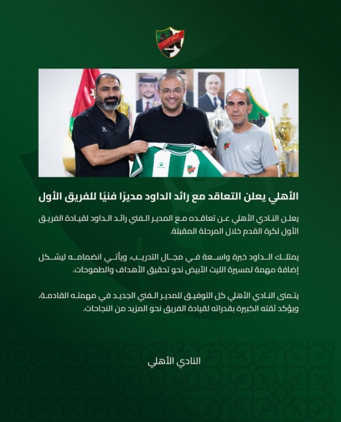 وقال النادي : ان الداود يمتلك خبرة واسعة في مجال التدريب، ويأتي انضمامه ليشكل إضافة مهمة لمسيرة الليث الأبيض نحو تحقيق الأهداف والطموحات ، متمنيا كل التوفيق للمدير الفني الجديد في مهمته القادمة، ويؤكد ثقته الكبيرة بقدراته لقيادة الفريق نحو المزيد من النجاحات.