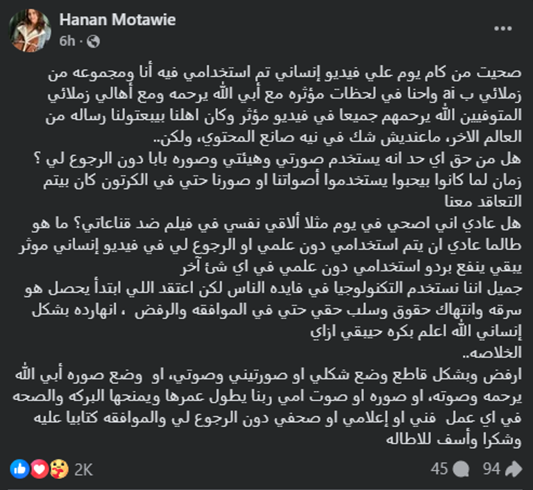 وأكدت مطاوع، عبر منشور على حسابها الرسمي بموقع "فيسبوك"، أن هذا الاستخدام غير المصرح به يمثل انتهاكًا واضحًا لحقوقها وحقوق أسرتها، مشيرة إلى أن الوسط الفني اعتاد في الماضي على وجود عقود رسمية تضمن موافقة الفنان قبل استخدام صورته أو صوته، بعكس ما يحدث الآن مع الذكاء الاصطناعي.