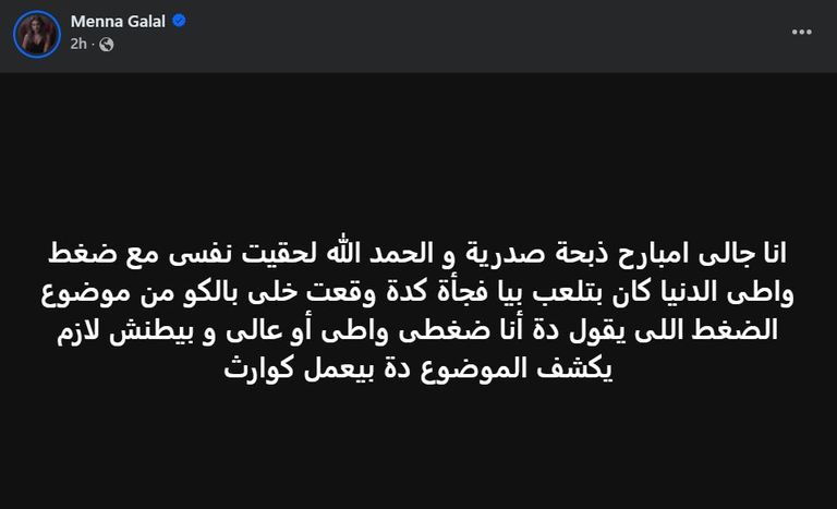 وكتبت منة على فيسبوك: "أنا جالي إمبارح ذبحة صدرية والحمد لله لحقت نفسي مع ضغط واطي، الدنيا كانت بتلعب بيا فجأة كده وقعت.. خلي بالكم من موضوع الضغط، اللي يقول ضغطي واطي أو عالي وبيطنش لازم يكشف.. الموضوع ده بيعمل كوارث".