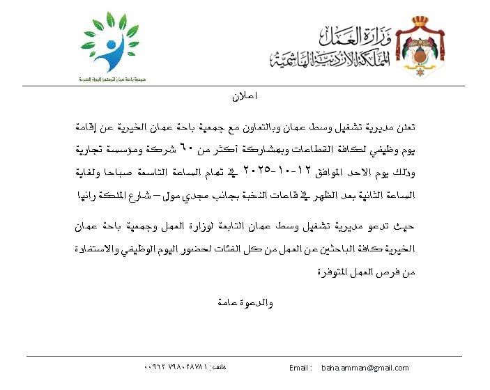 تعلن مديرية تشغيل وسط عمان وبالتعاون مع جمعية باحة عمان الخيرية عن إقامة يوم وظيفي لكافة القطاعات وبمشاركة أكثر من 60 شركة ومؤسسة تجارية وذلك يوم الاحد الموافق 12-10-2025 في تمام الساعة التاسعة صباحا ولغاية الساعة الثانية بعد الظهر في قاعات النخبة بجانب مجدي مول – شارع الملكة رانيا