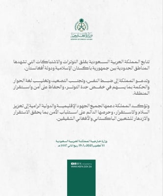 أصدرت الخارجية السعودية بيانا قالت فيه غنها تتابع بقلق التوترات والاشتباكات التي تشهدها المناطق الحدودية بين جمهورية باكستان الإسلامية ودولة أفغانستان.