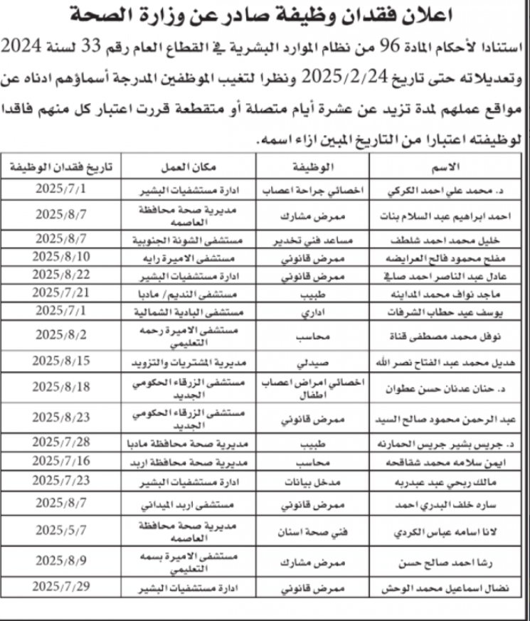 أعلنت وزارة الصحة، اليوم الأحد، 12-10-2025، عن فقدان موظفين لوظائفهم، نظرا لتغيبهم عن مواقع عملهم لمدة تزيد عن 10 أيام متصلة أو متقطعة.