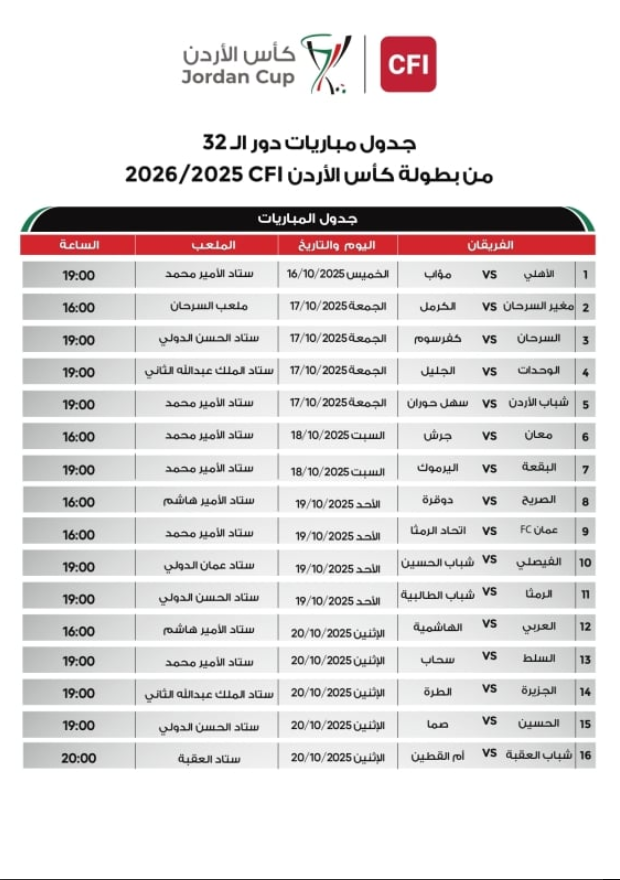 أصدر الاتحاد الأردني لكرة القدم، جدول مواعيد وأماكن إقامة مباريات دور الـ 32 من كأس الأردن CFI، لموسم 2025/2026.